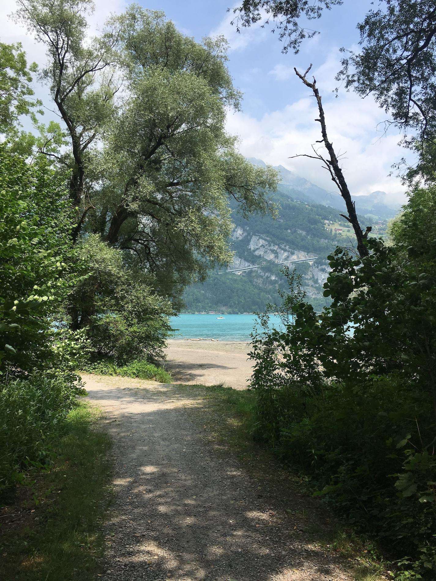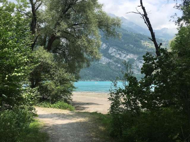 Von hier aus hat man den Blick über den ganzen Walensee. Der Sandstrand ist umsäumt von Bäumen und bietet je nach Sonnenstand auch Schatten.