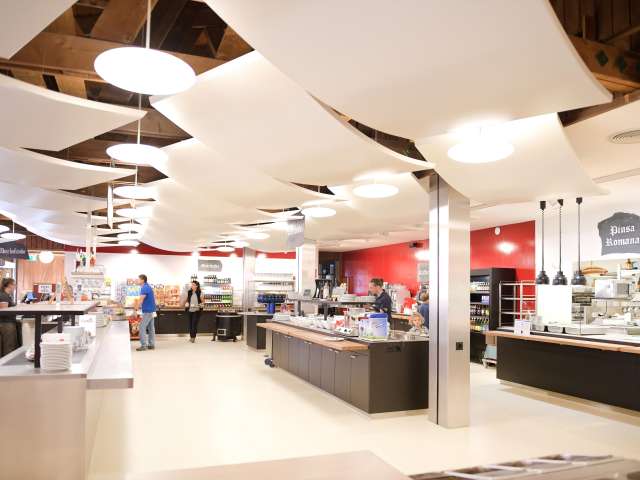 Das moderne Selbstbedienungsrestaurant Ämpächli mit Kaffeebar und grosser Sonnenterrasse ist der zentrale Treffpunkt für Gross und Klein.