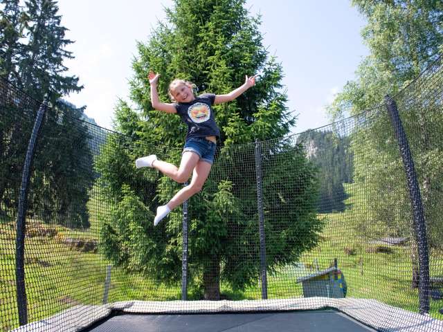 Ein Holzdrache zum Klettern, ein grosses Trampolin, ein Sandkasten mit Spielsachen, ein kleines Holzhaus, verschiedene Fahrzeuge wie Traktoren und Autos stehen für die kleinen Gäste bereit. Gemütliche Picknick Plätze am Schatten laden zum Pause machen ein.