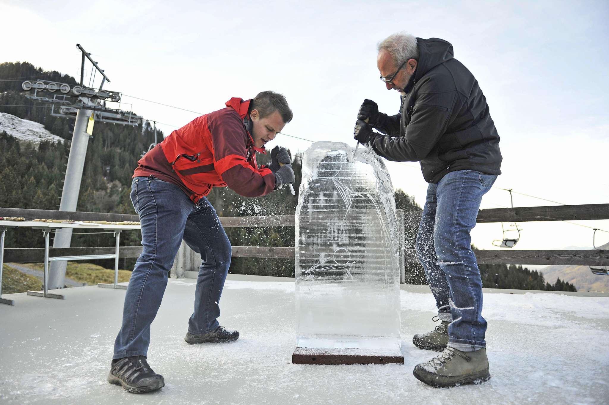 Eisblöcke, Schnitzwerkzeug, beleuchtete Arbeitsplattformen, Schutzhandschuhe, Leitung durch Eiskünstler