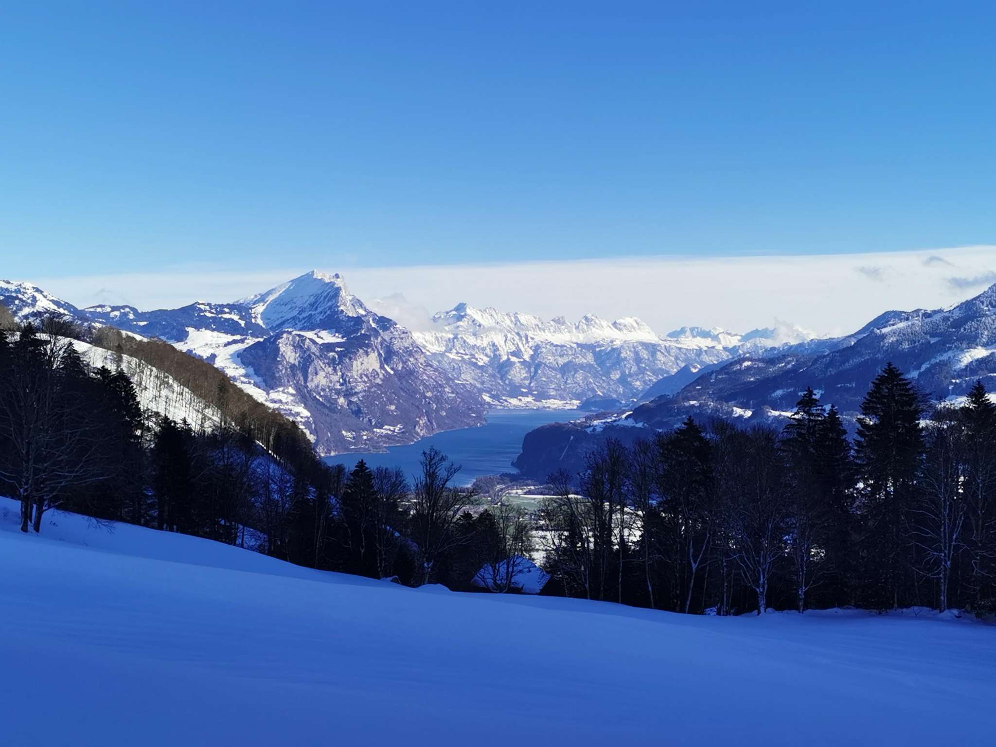 Diese leichte Tour führt über den Skulpturenweg an den Südhang des Hirzlis. Zahlreiche Holzskulpturen des einheimischen Holzbildhauers Thomas Jud säumen den Weg im tief verschneiten Bergwald.