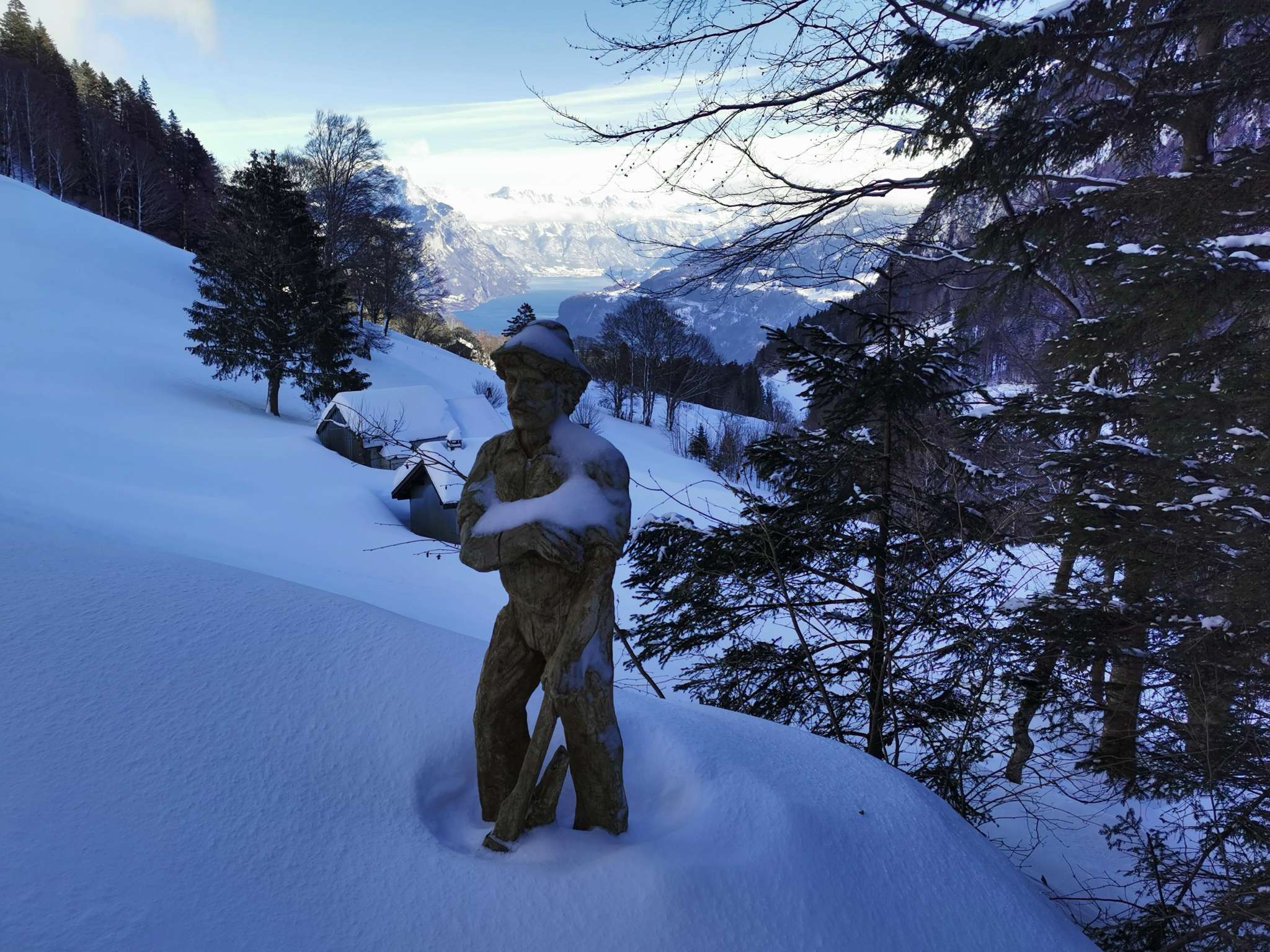 Im stillen Niederurner Täli sind die teilweise eingeschneiten Holzskulpturen am Wegrand besonders reizvoll!