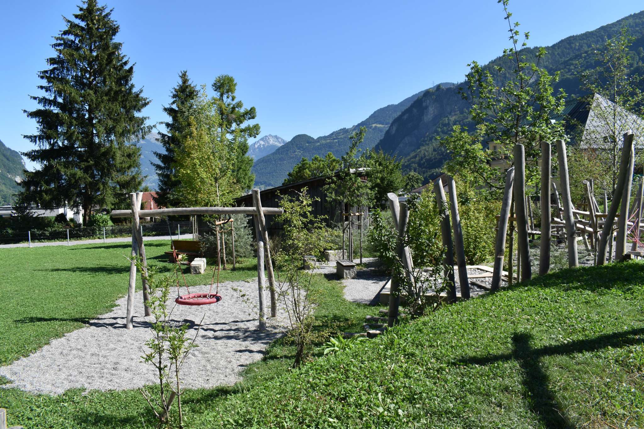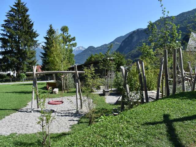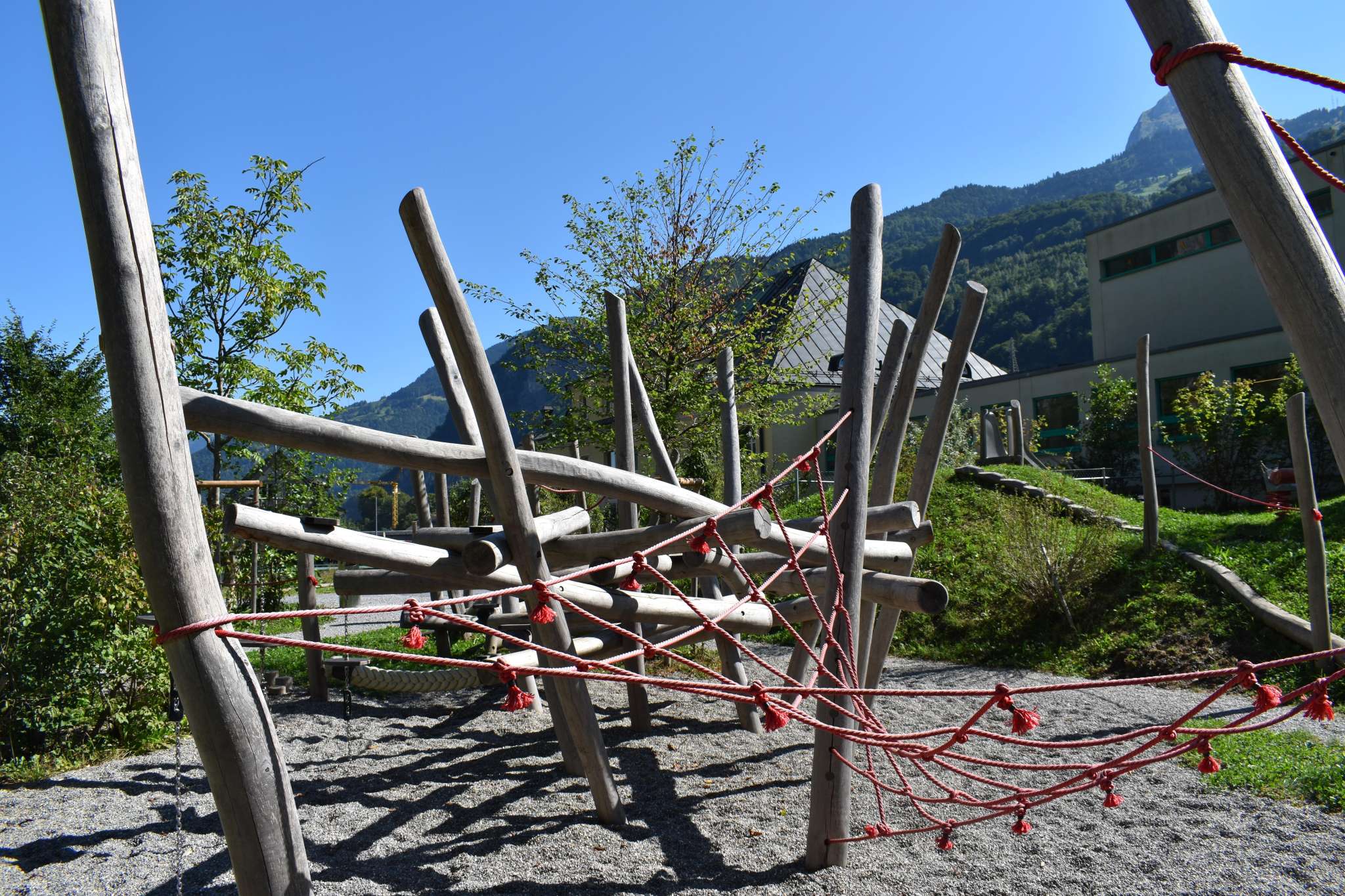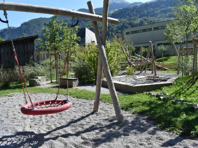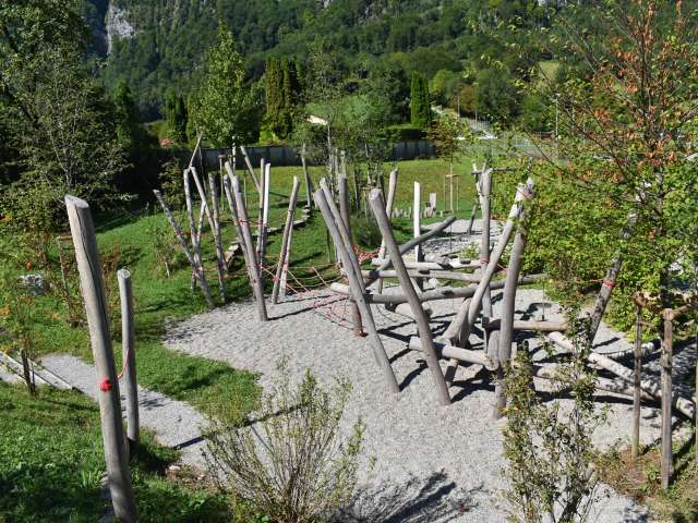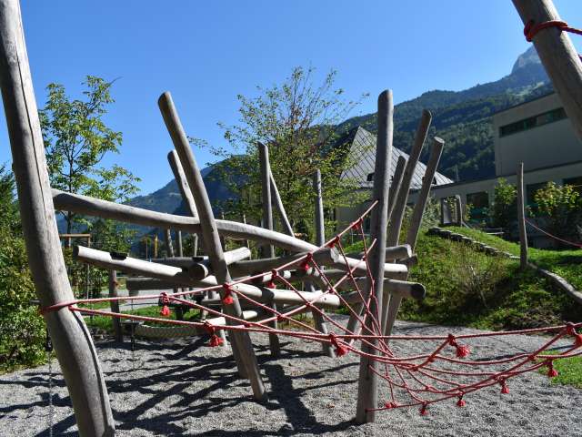Der Spielplatz mit grossem Klettergarten und Netzen, Schaukel und vielem mehr liegt in Netstal beim Schulhaus Wiggis - neben der Kirche.