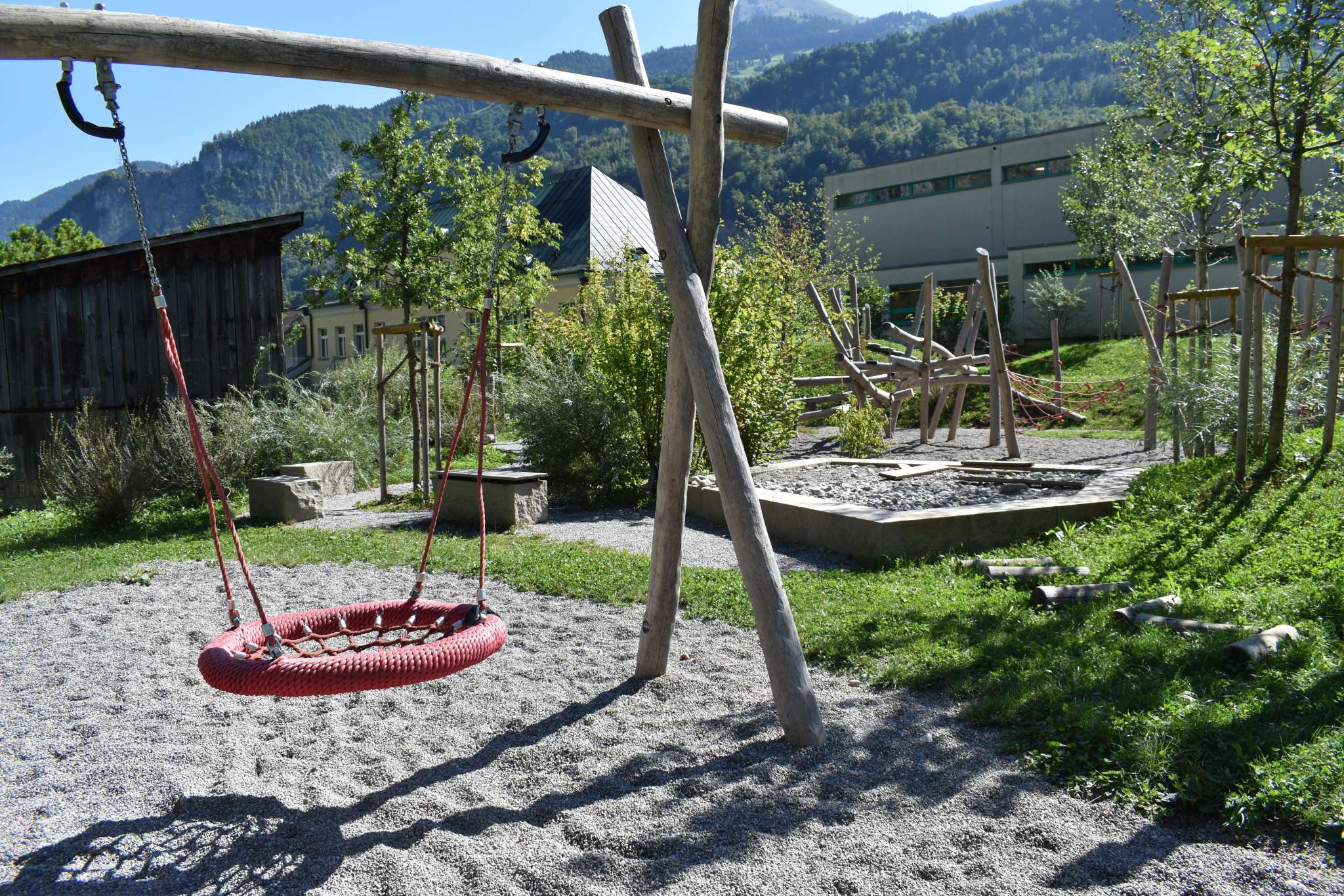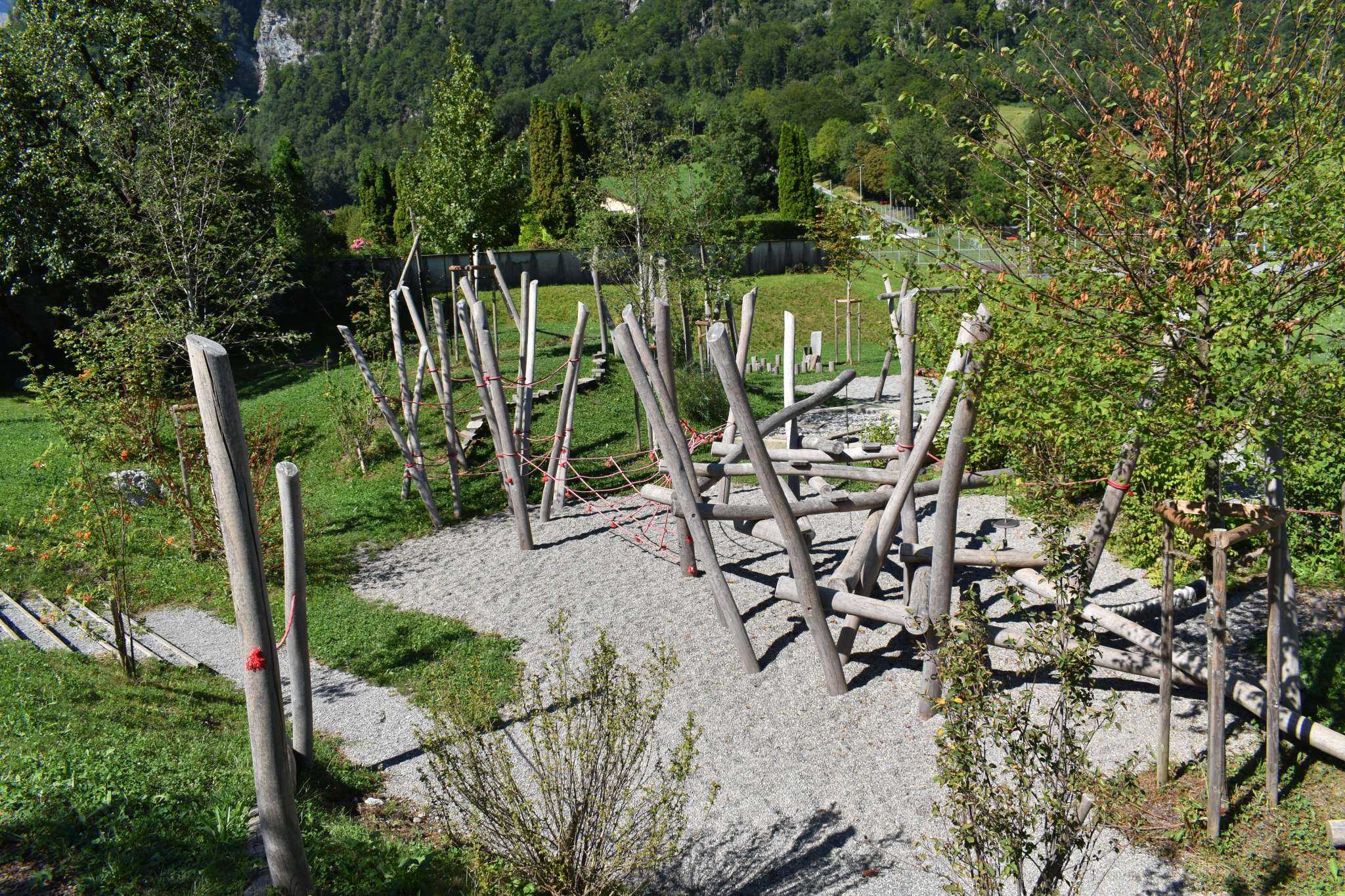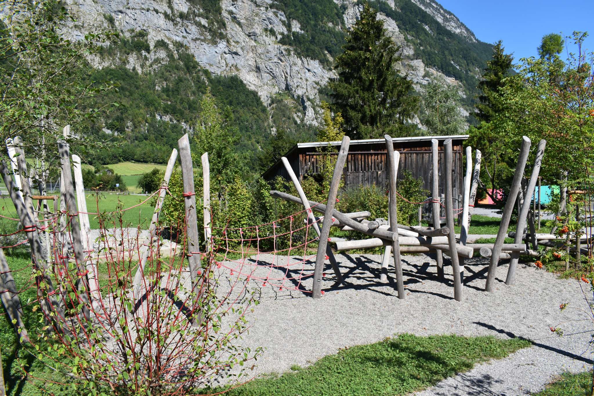 Der Spielplatz mit grossem Klettergarten und Netzen, Schaukel und vielem mehr liegt in Netstal beim Schulhaus Wiggis - neben der Kirche.