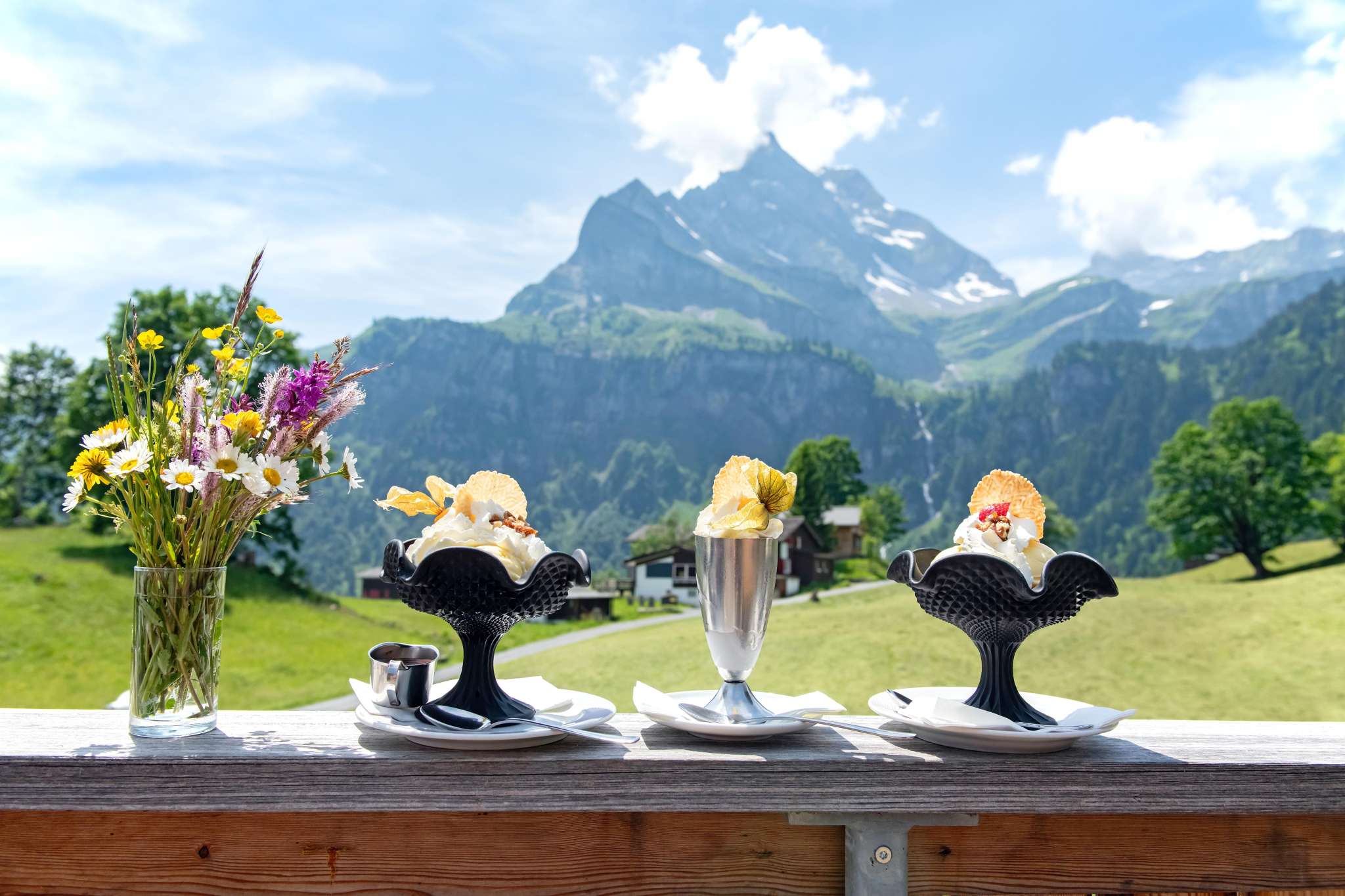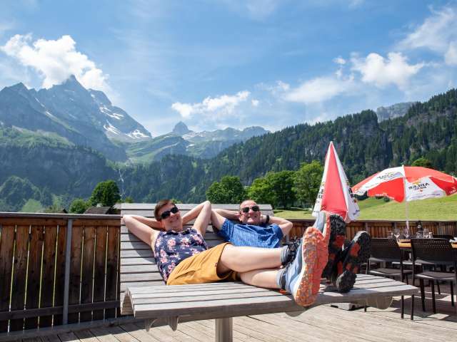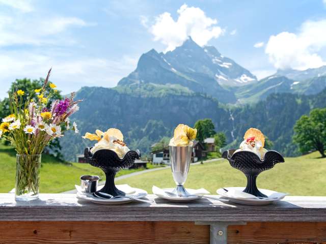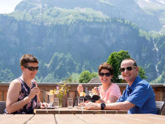 Geniesse auf unserer Sonnenterrasse den herrlichen Ausblick auf die Glarner Berge, lass dich von unserem Küchteam mit einem feinen Menü oder Tagesteller verwöhnen oder geniess einen köstlichen Tee oder Kaffee mit einem hausgemachten Stück Kuchen dazu.