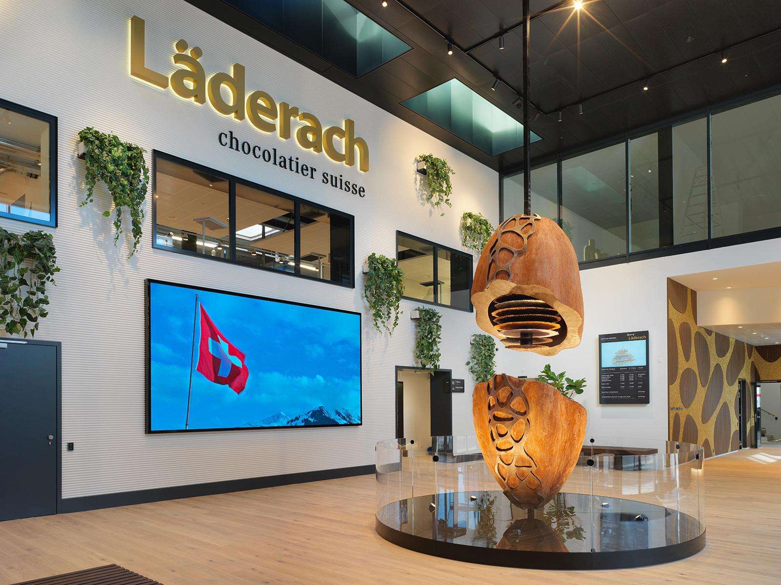 Der Rundgang im House of Läderach startet mit einer interaktiven Tour, die durch verschiedene Themenbereiche führt. Die Besucher lernen hier Wissenswertes über die Unternehmensgeschichte und erhalten einen ersten Einblick, wie man Schokolade mit allen Sinnen geniessen und degustieren kann. Ein fachkundiger Guide leitet den anschliessenden zweiten Teil des Rundgangs. Auf der 30-minütigen Tour erfahren die Gäste, wie aus der Kakaobohne die beliebte Schokolade entsteht und dabei stets die aussergewöhnliche Frische und Qualität bewahrt wird. Als genussvolle Ergänzung passieren die Gäste einen Schokoladenbrunnen, bei dem fleissig probiert werden darf. Der Rundgang endet mit der Lüftung des einzigartigen Frischegeheimnisses von Läderach.