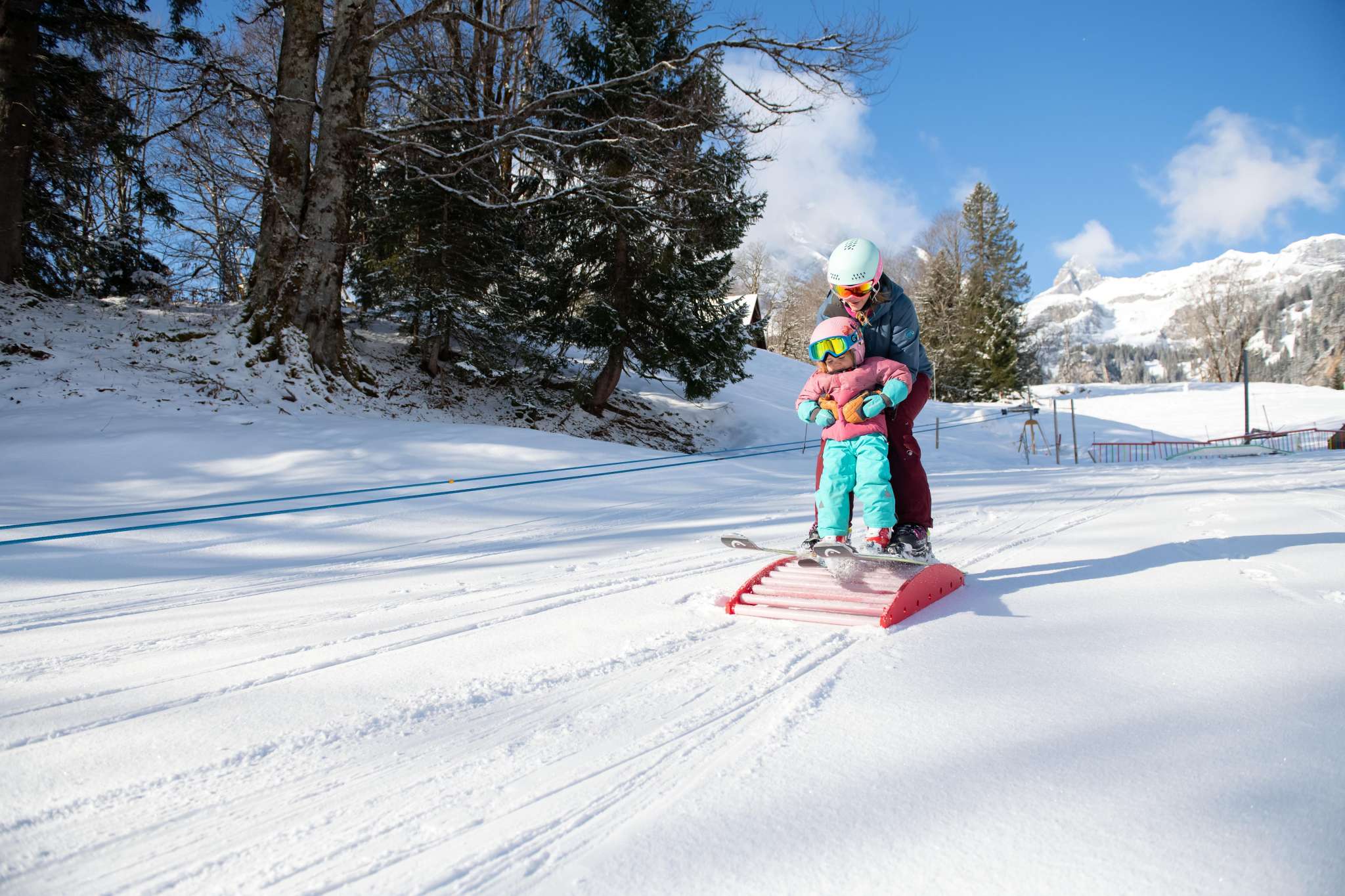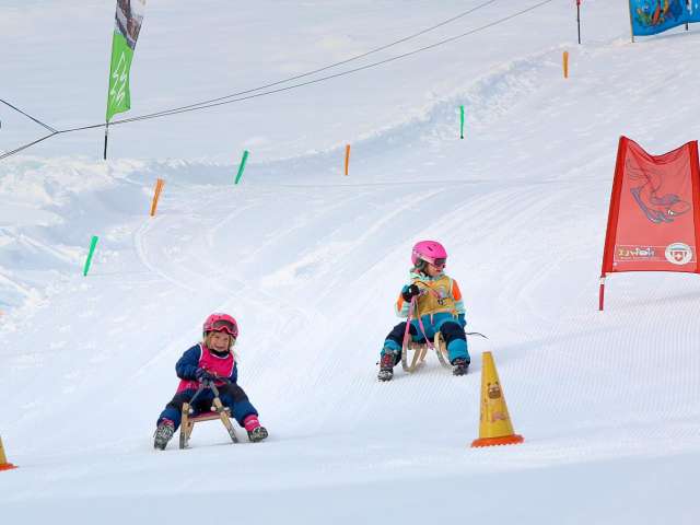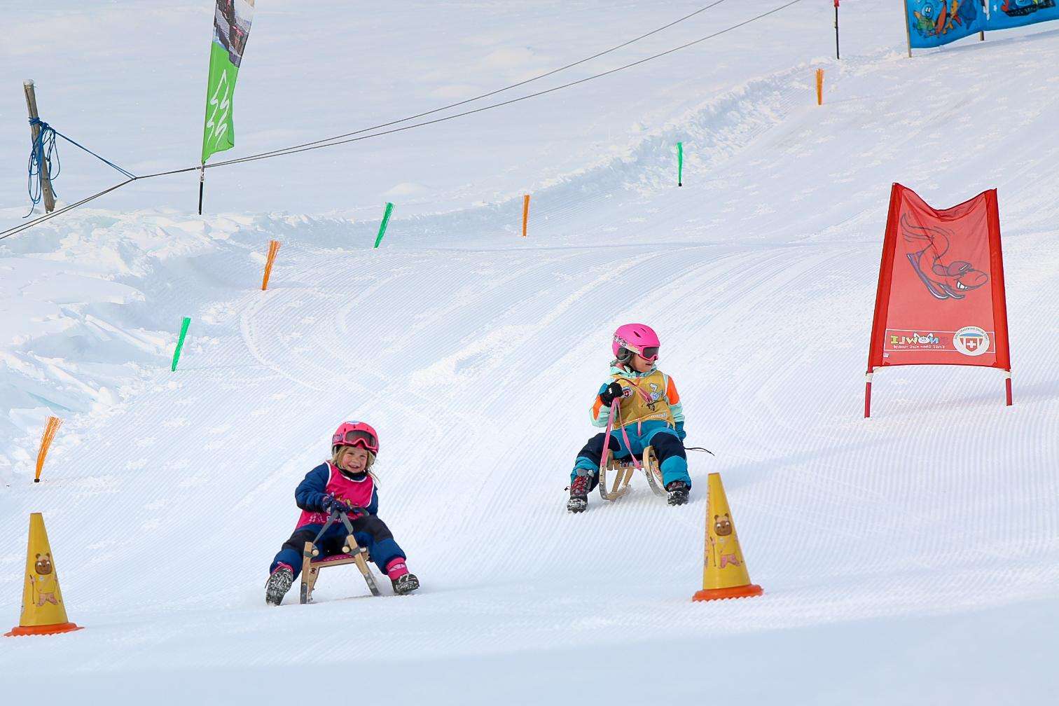 Schlitteln: Auf einem präparierten Hang können Kinder mit ihren Schlitten gefahrlos runterflitzen. Schlitten und Füdlibobs können bei der Schneesportschule gemietet werden.