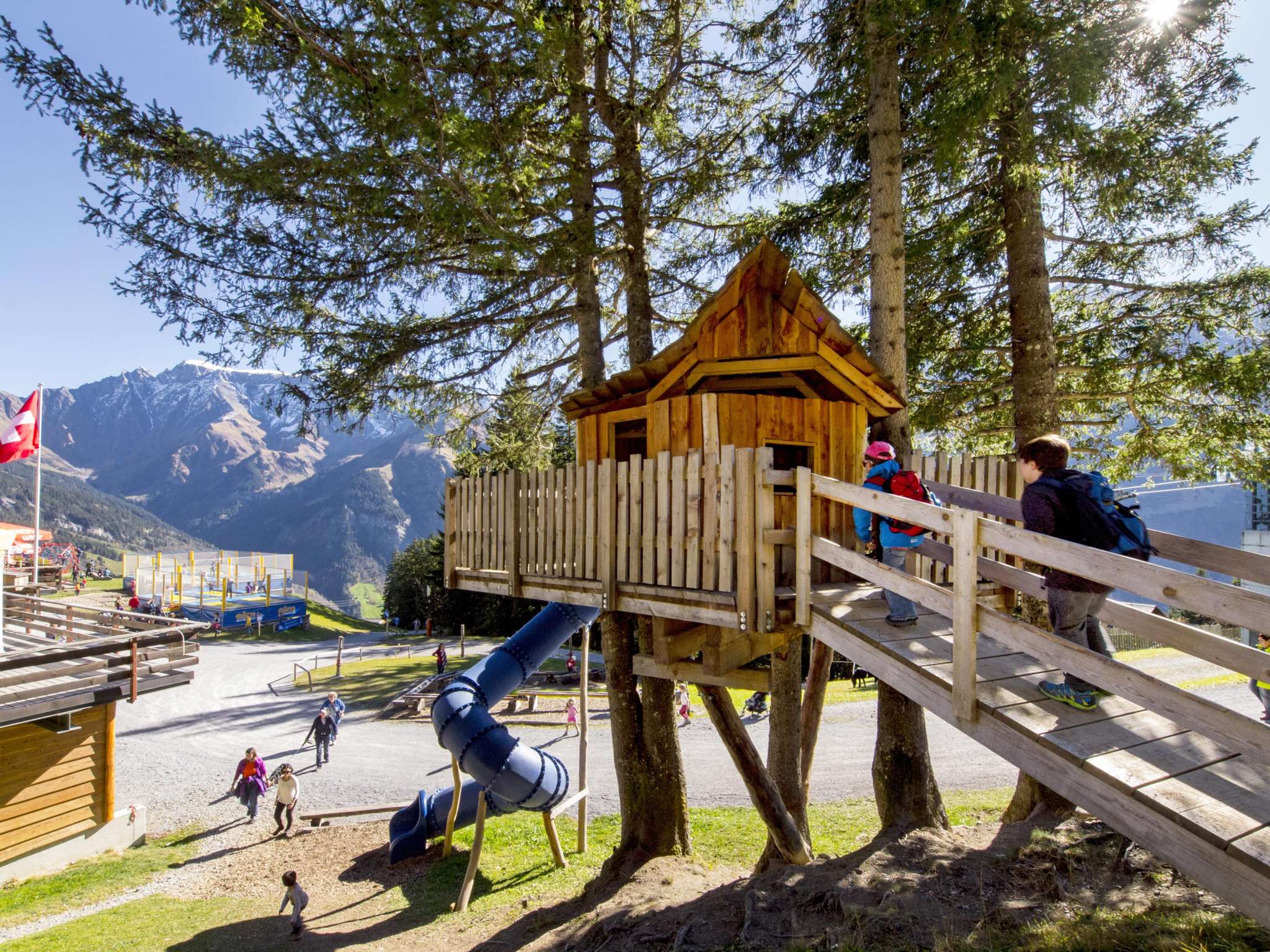 Wer träumt nicht als Kind von einem Baumhaus, hoch oben versteckt in den Baumwipfeln! In luftiger Höhe, umgeben vom schützenden Blätterdach der Bäume, können Kinder ihren Fantasien freien Lauf lassen und ihre Streiche aushecken. Auf Ämpächli werden Kinderträume wahr. Im Sommer können Kinder in ein Baumhaus klettern und via Rutschbahn direkt wieder zum Talboden sausen.