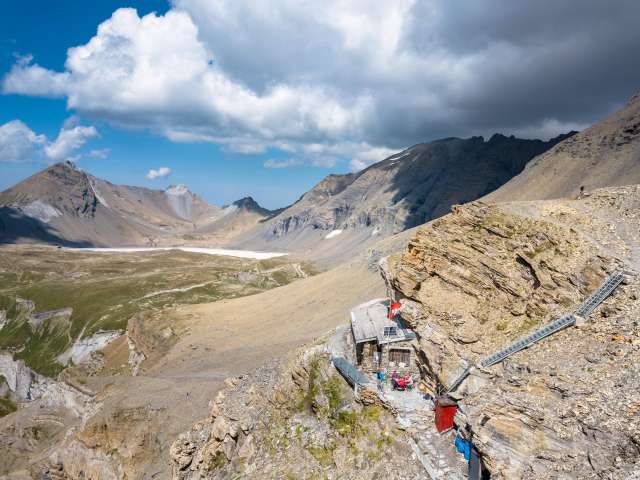 Wie ein Adlerhorst klebt die Kistenpasshütte auf 2714 m ü. M. am Felsen und bietet einen atemberaubenden Tiefblick auf den Limmernstausee und eine sagenhafte Aussicht auf Selbstsanft, Bifertenstock, Tödi bis zum Kaiserstock (SZ).