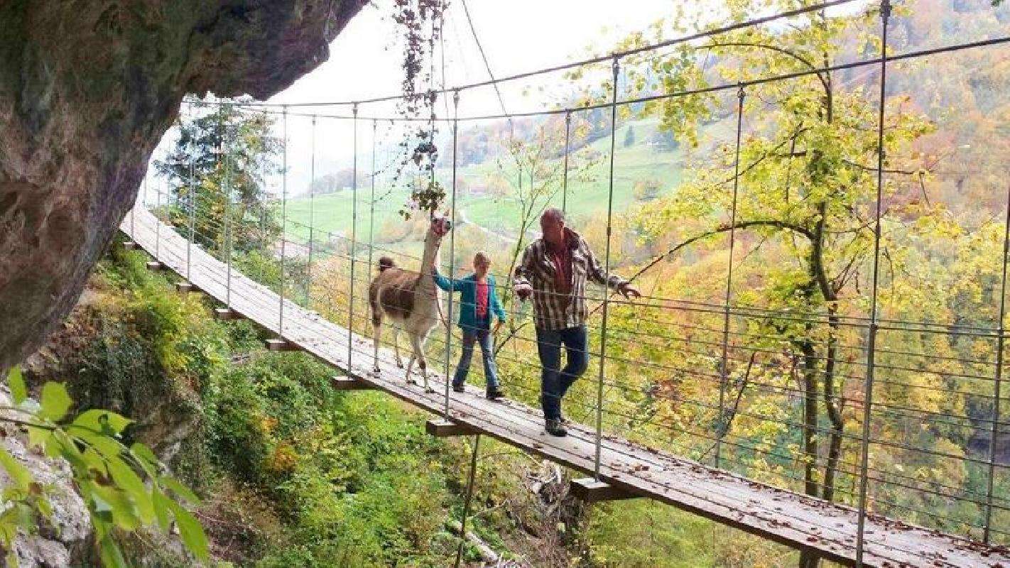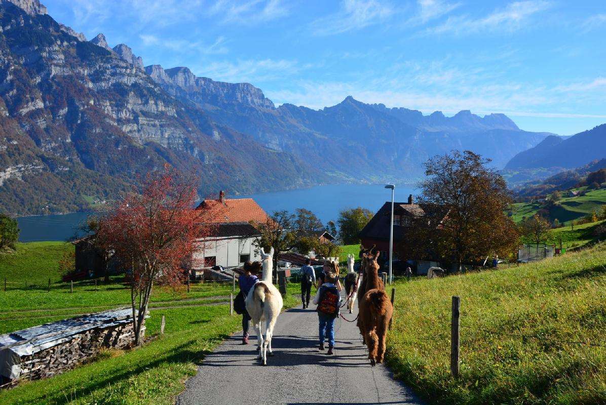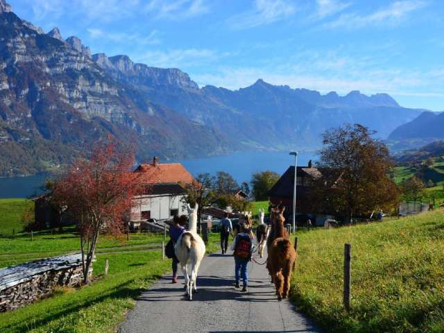 Lamas sind aufmerksam und intelligent. Ihr besonnenes und ruhiges Wesen macht sie auch für Kinder zum idealen Begleiter. Das gemütliche Tempo der Tiere und ihre Neugier veranlassen uns, die Umgebung auf eine andere Art wahrzunehmen. Wir starten die Touren auf unserem Hof. Dieser befindet sich im östlichsten Zipfel des Glarnerlands, hoch über dem Walensee. Schnuppertour Auf dem alten Römerweg wandern wir auf abwechslungsreichen Wegen nach Walenguflen. Über die Hängebrücke und durch das Felsentunnel in den Fuchsfallen geht es wieder zurück. Dauer: 1.5 bis 2 Stunden. Brätlitour Wir wandern über Walenguflen nach Obstalden. Danach geht es hoch über dem See weiter Richtung Filzbach. Im Rüteggwald bräteln wir eine Wurst oder kochen auf dem Feuer ein Fondue. Auf dem Rückweg geniessen wir die schöne Aussicht auf den Walensee. Dauer: ca. 6 Std, Wanderzeit 3 Std. Beizlitour Über den Römerweg wandern wir nach Filzbach ins Restaurant Panorama Lihn. An herrlicher Aussichtslage über dem Walensee lassen wir uns dort verwöhnen. Zurück geht es über den Gugger ins Mittlisor. Bei Walenguflen wandern wir über die Fuchsfallen mit ihrer Hängebrücke wieder zurück zum Hof. Dauer: ca. 6 Std., Wanderzeit 4 Std.