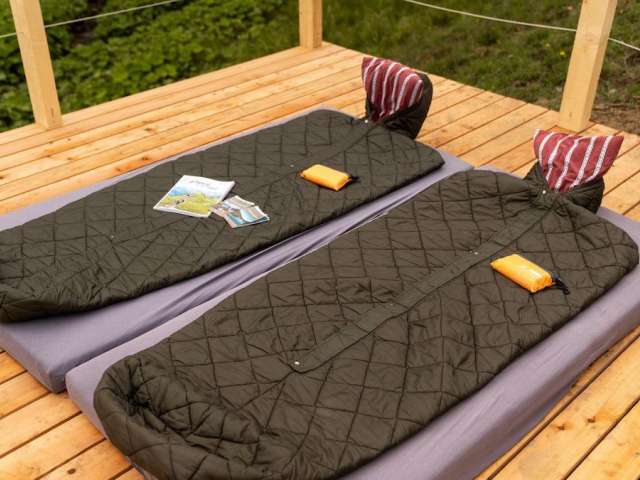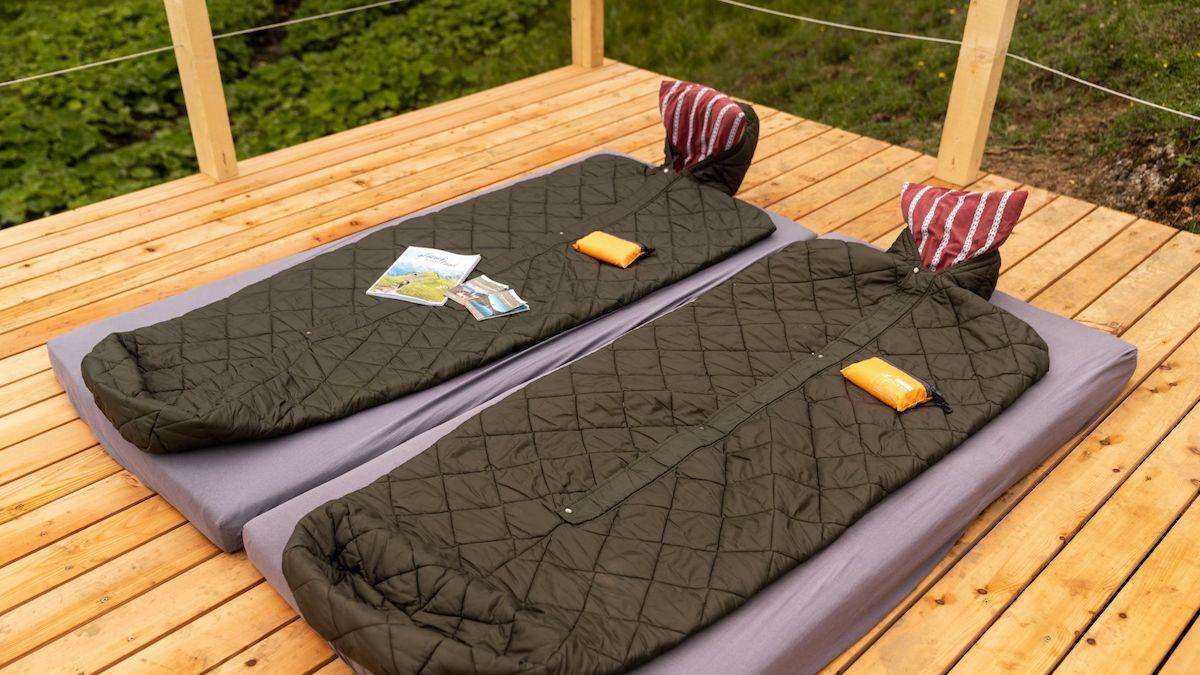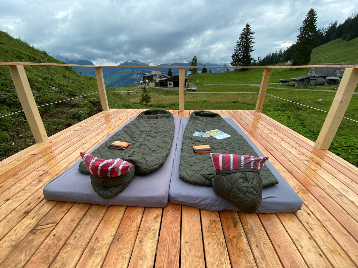 Gäste schlafen im Schlafsack auf einer Holzplattform auf der Alp Habergschwänd mitten in den Bergen. Hier kann man den Sternenhimmel und das Outdoor-Erlebnis so richtig geniessen. Das Berggasthaus Habergschwänd mit den sanitären Anlagen liegt in Fussnähe. Sollte das Wetter nicht mitspielen, kann alternativ im Stroh oder im Mehrbettzimmer im Berggasthaus übernachtet werden.