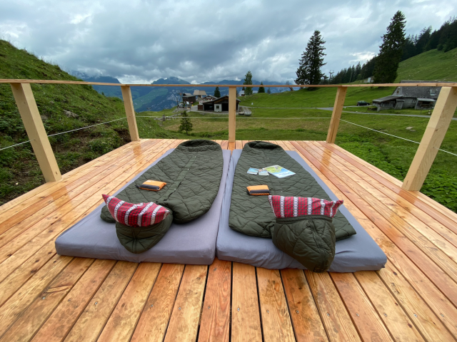Sich auf der lauschigen Holzplattform gemütlich in den Schlafsack kuscheln und die idyllische Bergwelt um einen geniessen: Das gibt es auf der Alp Habergschwänd hoch über dem Walensee – Bergnatur pur.