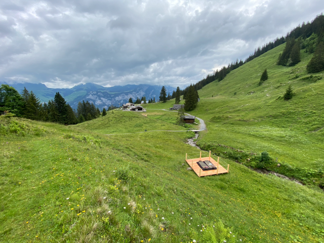 Plattform 3 ist kleiner und mobil. Sie wird je nach Weidegang an verschiedenen Orten unterhalb des Berggasthauses platziert und bietet immer eine neue Aussicht.