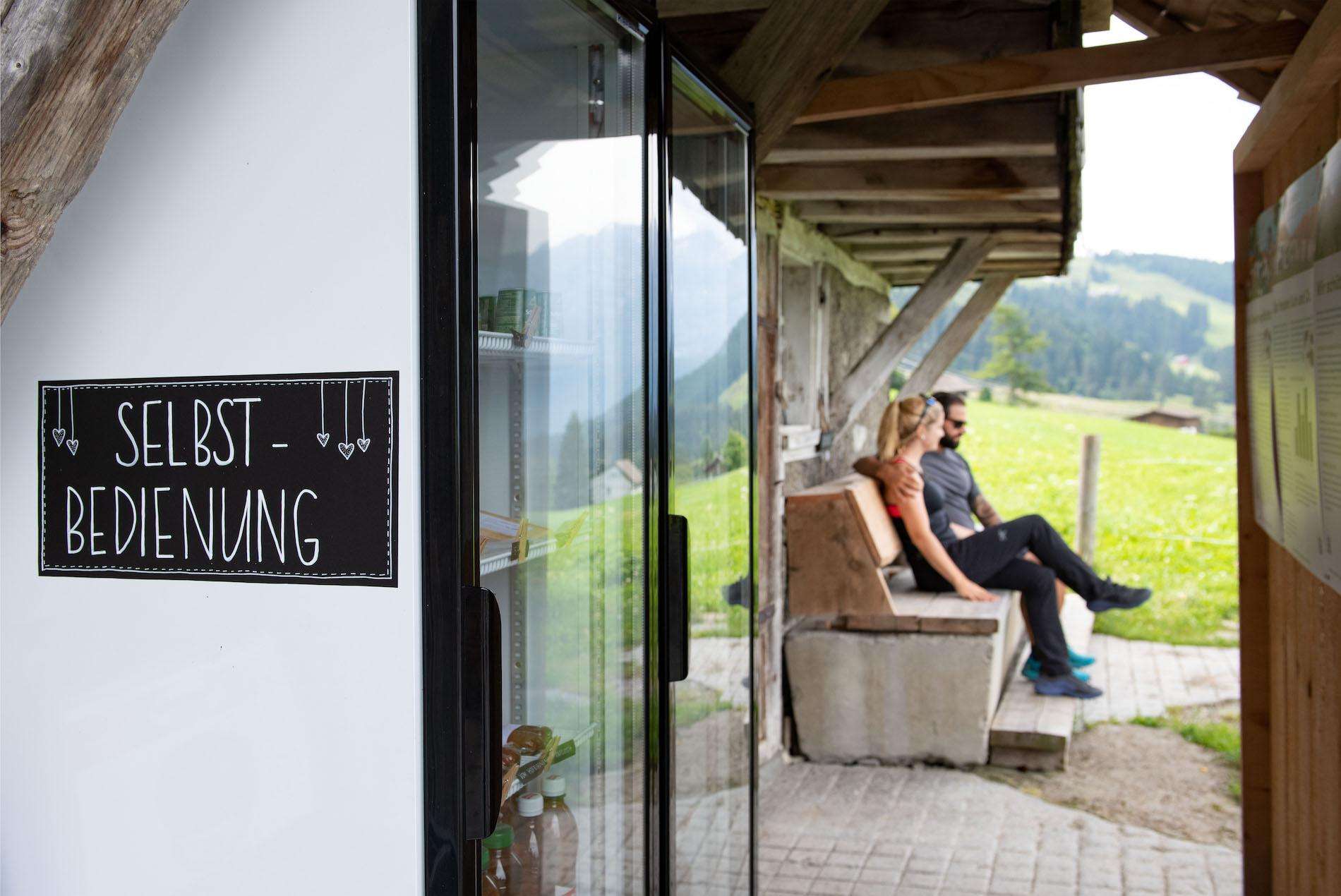 Das Mullerä-Beizli beinhaltet eine gemütliche Sitzgelegenheit sowie zwei Gastrokühlschränke. Sie sind gefüllt mit Getränken und Snacks wie beispielsweise feinen Kuchen und Zutaten fürs Plättli. Das Angebot basiert auf Selbstbedienung und ist für Wanderer, Biker und Tagestouristen frei zugänglich.