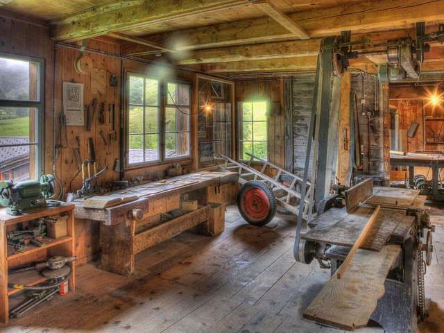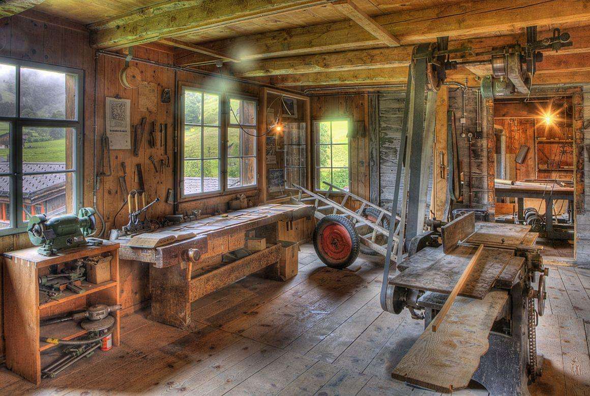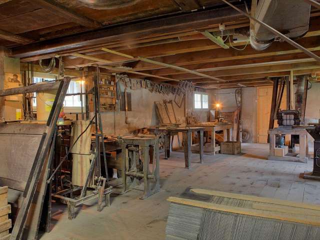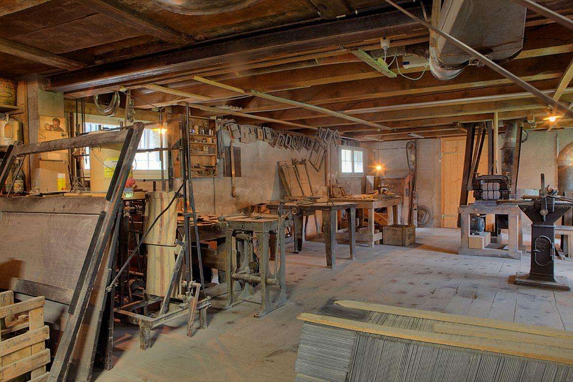 Sämtliche Werkzeuge, die einzigartigen und speziellen Gerätschaften und die mit Transmissionsriemen angetriebenen Maschinen sind noch vorhanden und vollkommen funktionstüchtig. Schieferstaub, Sägemehl und Leimgeruch durchziehen die Fabrikationsräume.