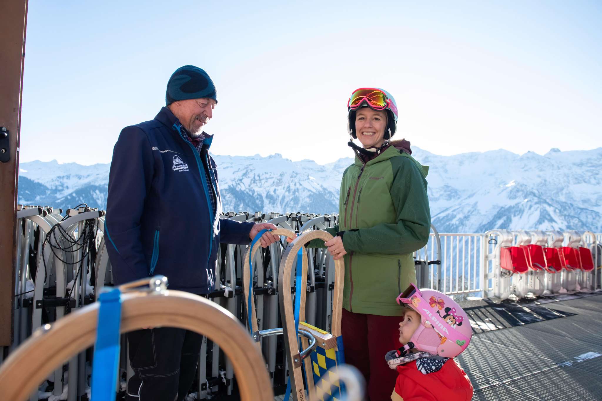 Für dein Schlittenabenteuer brauchst du natürlich den passenden Schlitten. Diese können in Braunwald an der Bergstation Grotzenbüel gemietet werden.