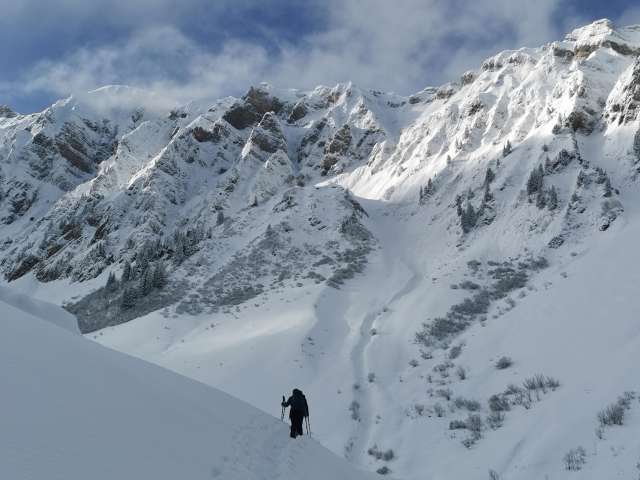 Am Anfang gehen wir gemächlich steigend zur Ferienhaussiedlung Sulzboden, danach etwas steiler hoch zu den paar Ferienhäusern im Sulz. Oberhalb dem Stäfeli geht es weiter zur Lachenalp und schliesslich ziemlich steil hoch zum Längeneggpass. Die Gegend ist wildromantisch mit den imposanten Felswänden gegen Westen und den sanften Hügeln entlang der Route. Hier haben wir im oberen Teil gute Chancen, eine eigene Spur anzulegen und können dabei so richtig die Einsamkeit geniessen. Der Weg zurück geht entlang der Aufstiegsroute mit verschiedenen Möglichkeiten für Abkürzungen.