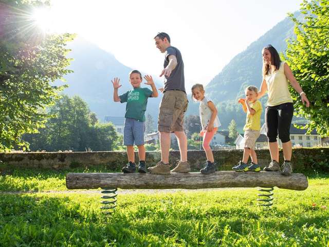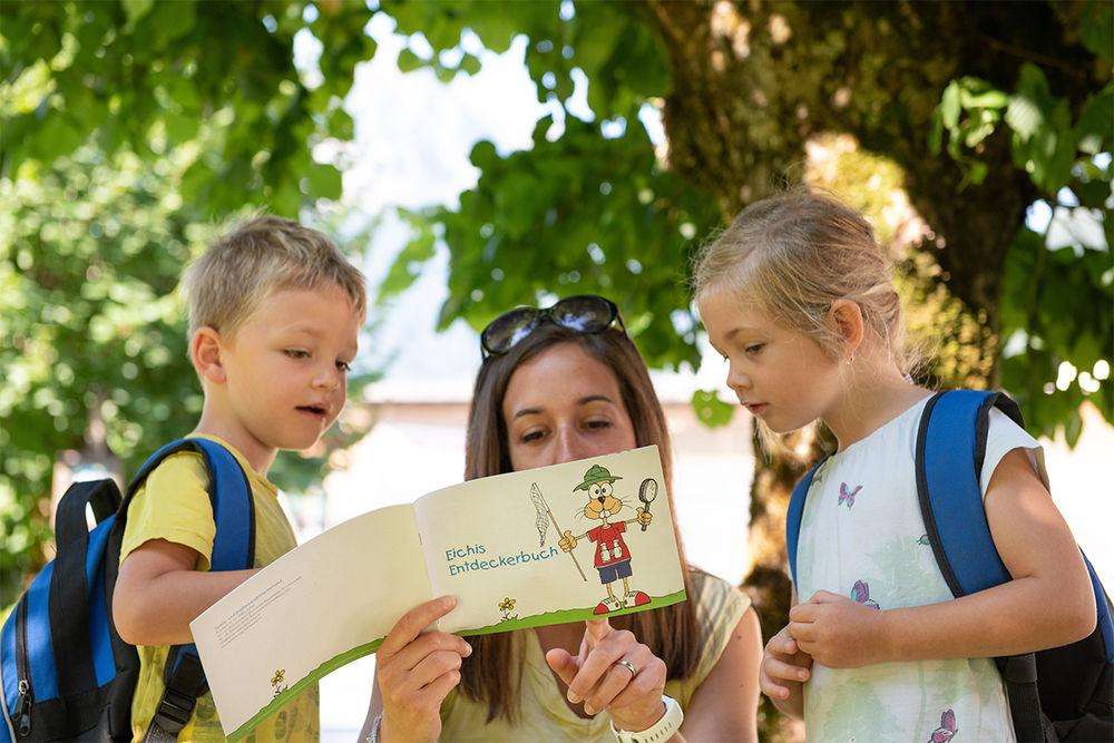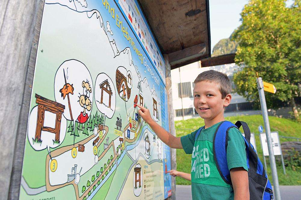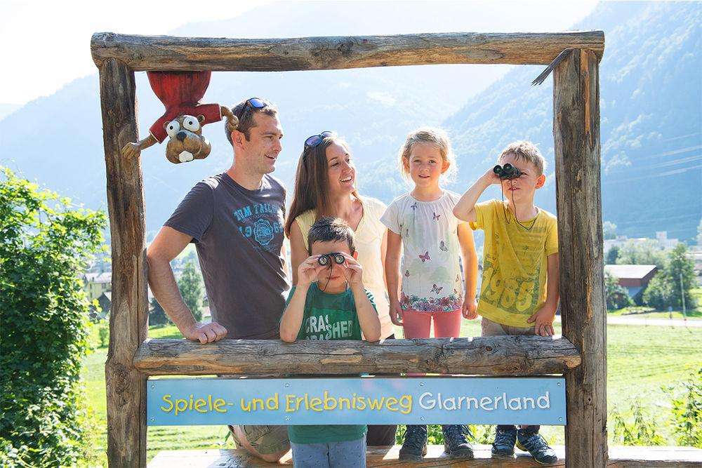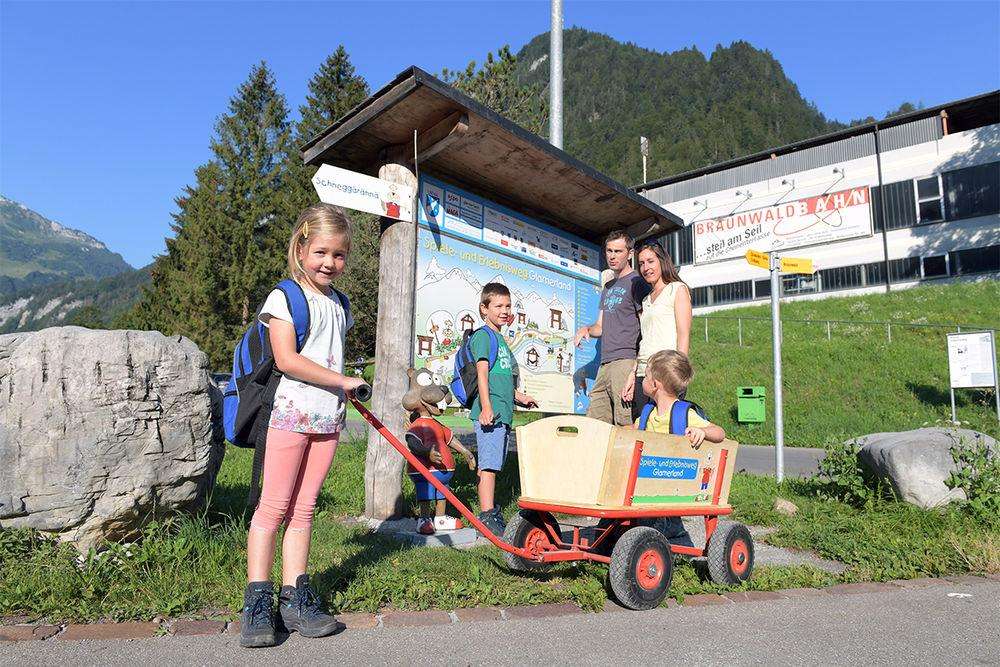 Der ganze Weg ist kinderwagentauglich - so sind schon die Jüngsten auf den Abenteuern von Eichi mit dabei. Bei der Braunwaldbahn-Talstation können auch Bollerwagen gemietet werden.