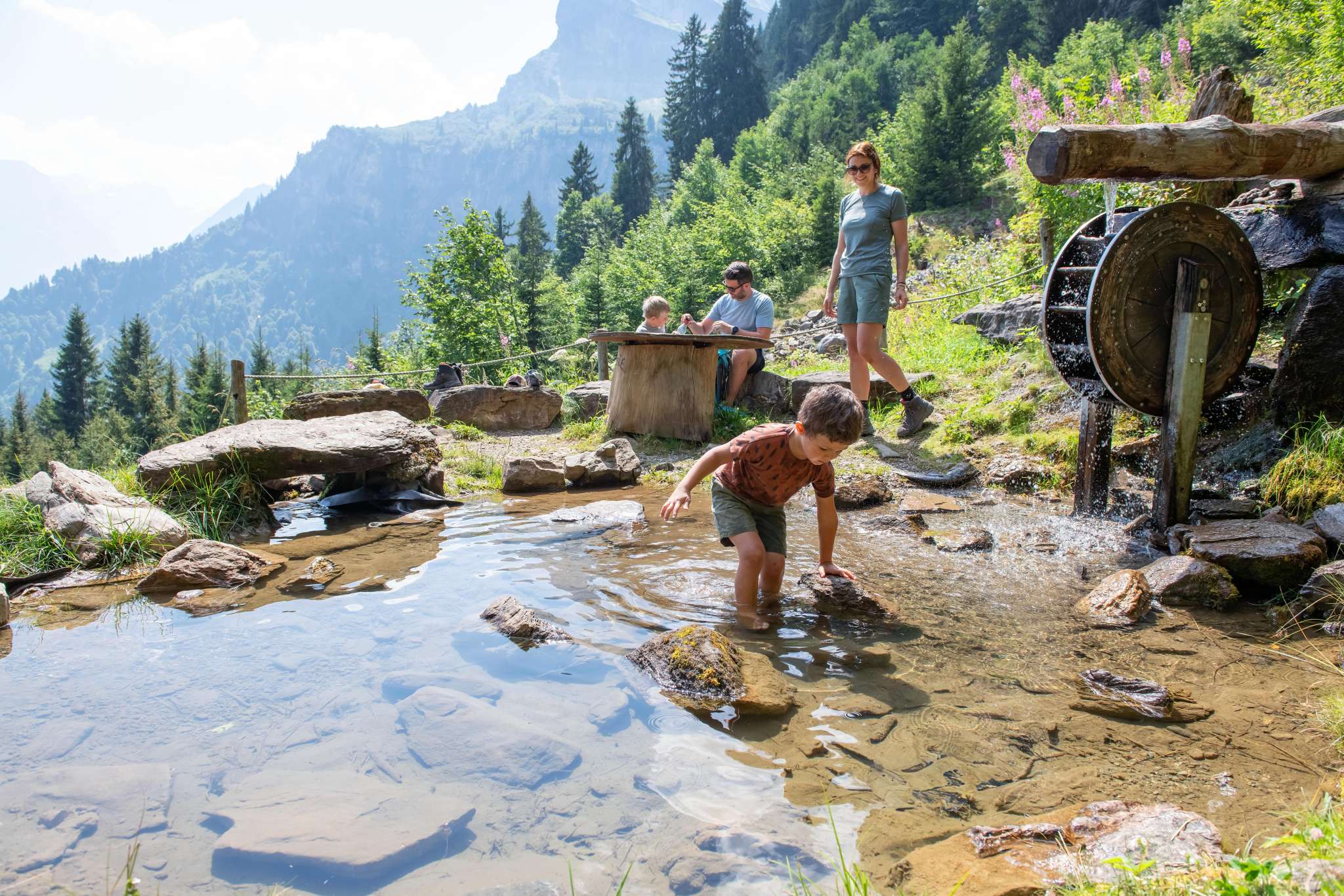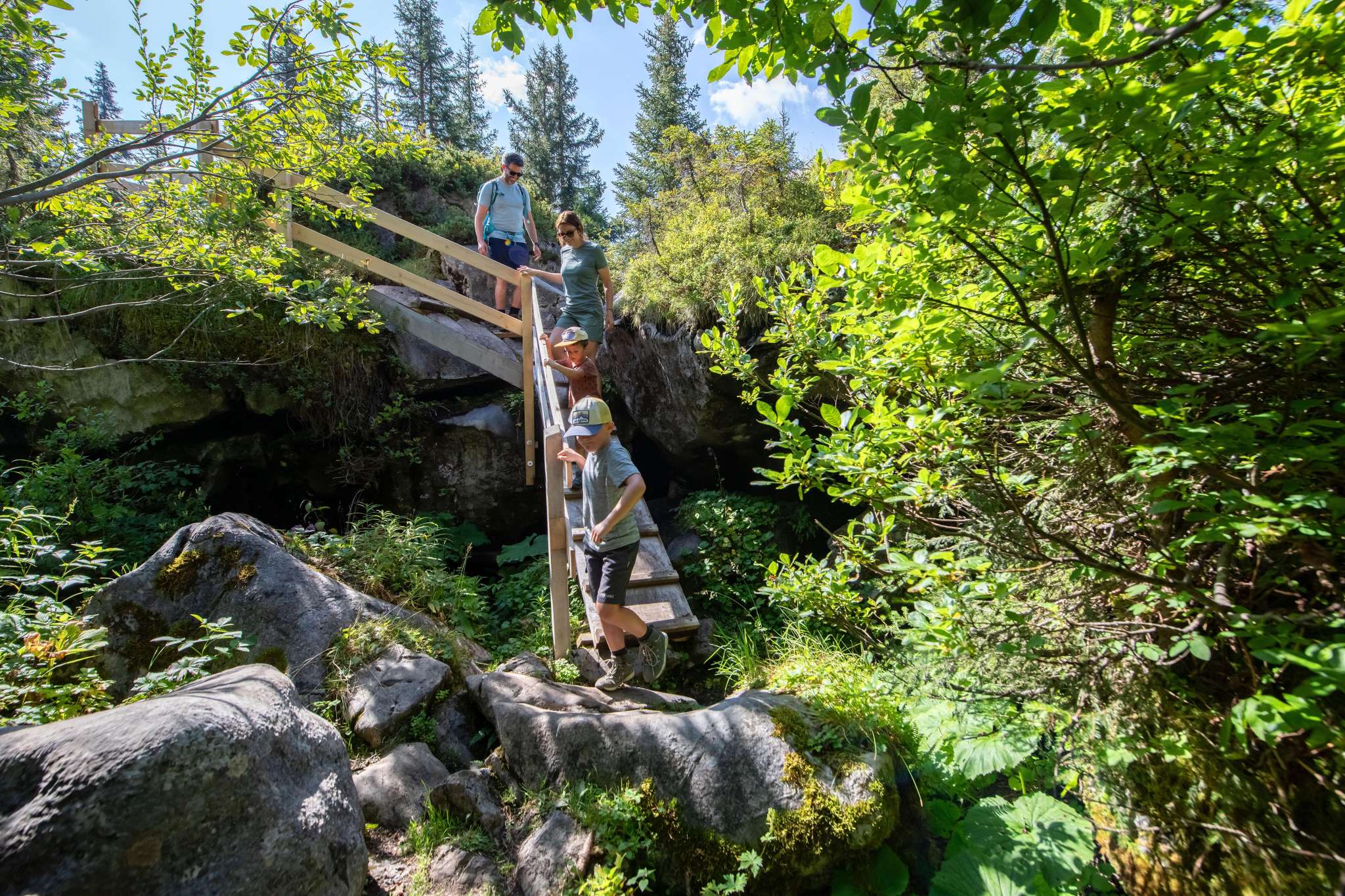 Der Zwerg Bartli mit seinem langen Bart, seiner roten Hose und seinem grünen Pullover kommt von Mitte Juni bis Oktober aus seinem Hüttli, um Familien willkommen zu heissen und ihnen seinen Wald zu zeigen. Der Weg führt vorbei am mächtigen Brummbachfall mit dem Wasserspielplatz, am kleinen Holzhaus der Tante Tiidi, welche einst dem Zwerg die Hosen flickte. Wer die Edelsteinspalte entdecken geht, wo Bartli den leuchtend roten Edelstein fand, findet noch seinen Pickel und seine Grubenlampe. Man könnte meinen, er sei soeben aus der Miniaturschlucht herausgesprungen. Vielleicht hinauf in die Höhle von Zwerg Ägiidi, wo dessen Tischchen und sein Bettchen stehen? Auch hier kann er nicht weit sein, denn die Grubenlampe flackert noch und im Tellerchen liegt noch etwas von seinem Znüni, welches Kinder für ihn bereitgelegt haben. Wenn Zwerg Bartli aber nicht zu Hause in seinem Rindenhüttli ist, dann trifft man ihn womöglich im Zwergenschloss bei der imposanten Spalte im Felsen an, dort wo der Thron des Zwergenkönigs steht, die Kerzen brennen und im Spiegelsaal die letzten Blumen vom grossen Zwergenball liegen.